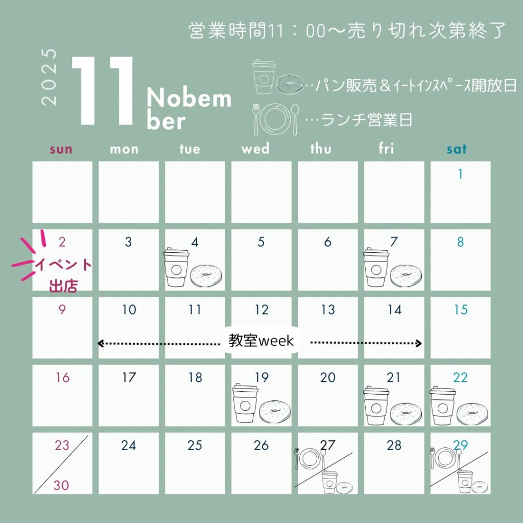 ランチ営業日、パンのみ販売日、教室開講日などはカレンダーにてご確認下さい(*^_^*)